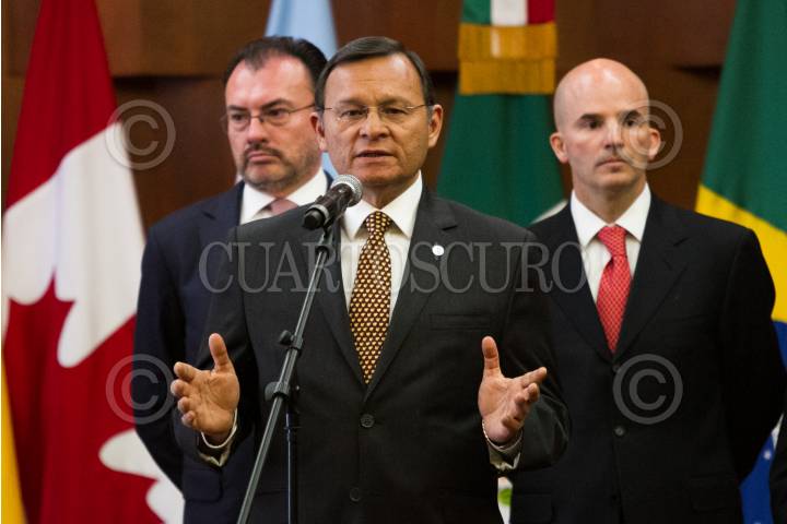CIUDAD DE MÉXICO, 14MAYO2018.- Néstor Popolizio, ministro de Relaciones Exteriores de Perú; Luis Videgaray Caso, secretario de Relaciones Exteriores; y José Antonio González Anaya, secretario de Hacienda, ofrecieron una conferencia de prensa tras concluir la Reunión de Ministros de Relaciones Exteriores y Finanzas del Grupo de Lima, en el edificio de la SRE. Los ministros ahí presentes llamaron al gobierno venezolano a suspender las elecciones presidenciales que se habrán de realizar el próximo fin de semana en la nación sudamericana. FOTO: MOISÉS PABLO /CUARTOSCURO.COM