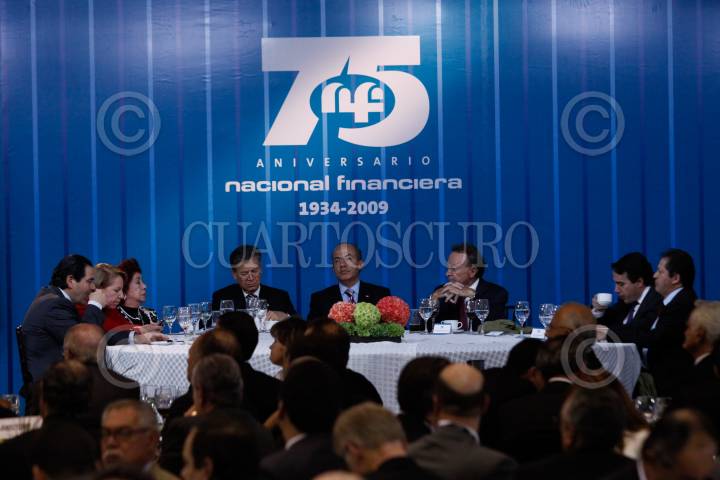 MÉXICO, D.F. 16OCTUBRE2009.- Ignacio Deschamps, presidente de la Comisión Bancaria y de Valores; Georgina Kessel, Secretaria de Energía; Héctor Rangel Domene, director general de Nacional Financiera; Felipe Calderón Hinojosa, presidente de México y Guillermo Ortiz, presidente del Banco de México durante el 75 Aniversario. FOTO: IVÁN STEPHENS/CUARTOSCURO.COM