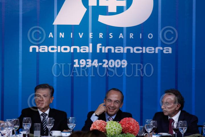 MÉXICO, D.F. 16OCTUBRE2009.- Héctor Rangel Domene, director general de Nacional Financiera (NAFINSA); Felipe Calderón Hinojosa, presidente de México y Guillermo Ortiz Martínez, presidente del Banco de México durante el 75 Aniversario. FOTO: IVÁN STEPHENS/CUARTOSCURO.COM
