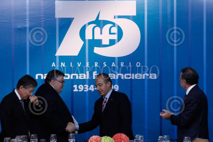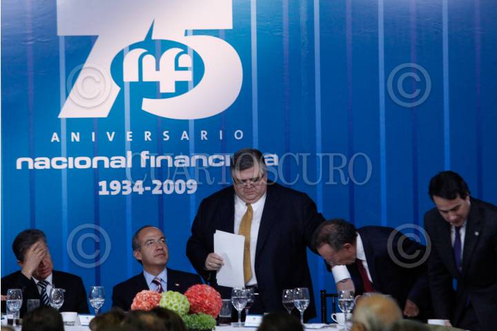 MÉXICO, D.F. 16OCTUBRE2009.-Héctor Rangel Domene, director general de Nacional Financiera (NAFINSA); Agustín Guillermo Carstens Carstenes, Secretario de Hacienda y Crédito Público (SHCP); Felipe Calderón Hinojosa, presidente de México y Guillermo Ortiz Martínez, presidente del Banco de México durante el 75 Aniversario. FOTO: IVÁN STEPHENS/CUARTOSCURO.COM