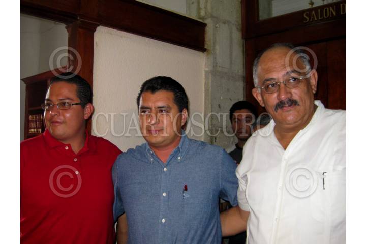 CHILPANCINGO, GUERRERO, 09JULIO2009.- Marcos Cesar Mayares, Armando Soto Diaz y Gerardo Nabor Ojeda de la Peña, luego de tomar protesta a sus cargos como nuevo director de protección civil municipal, nuevo secretario de desarrollo social municipal y nuevo director de CAPACH, en el interior del Palacio Municipal. FOTO: OSCAR ALVARADO/CUARTOSCURO.COM