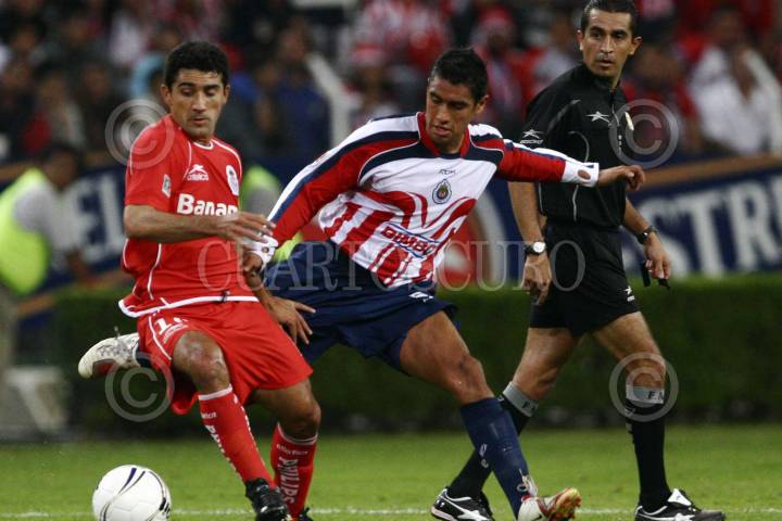 GUADALAJARA, JALISCO, 07DICIEMBRE2006.- En un partido muy cerrado las Chivas Guadalajara y los Diablos del Toluca empatan a un gol en el partido de ida por la final del campeonato mexicano. En la imagen el rojiblanco Gonzalo Pineda elude a el toluqueño Naelson Zinha. FOTO: JOSÉ MARÍA MARTÍNEZ/CUARTOSCURO.COM