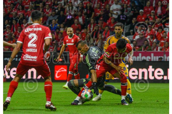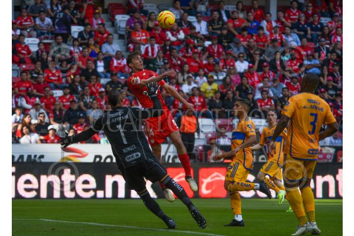 Nahuel Guzmán portero de Tigres pelea el balón con Camilo Da Silva delantero de los Diablos de Toluca durante el encuentro en el estadio Nemesio Diez.