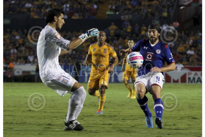 SAN NICOLAS DE LOS GARZA, NUEVO LEON, 18OCTUBRE2014.- Nahuel Guzman del equipo de los Tigres de la UANL en una jugada contra Hugo Pavone del equipo del Cruz Azul, en el estadio Universitario, partido correspondiente a la jornada 13 de la Liga MX, Apertura 2014. FOTO: GABRIELA PEREZ MONTIEL /CUARTOSCURO.COM