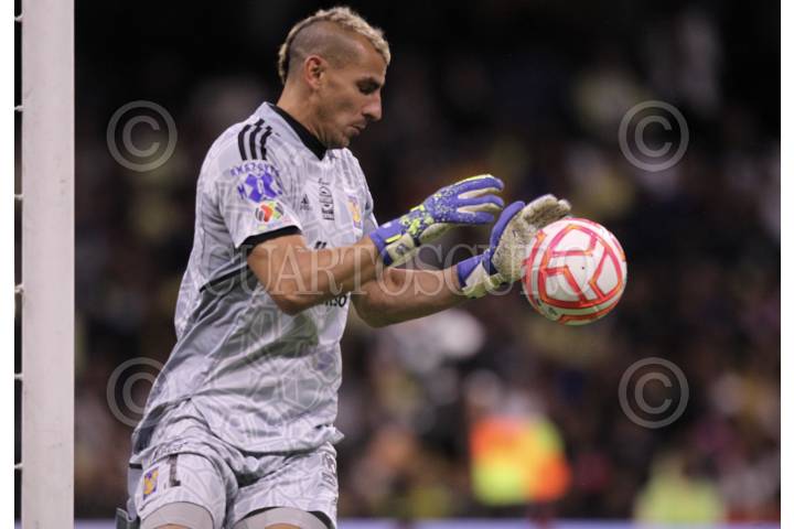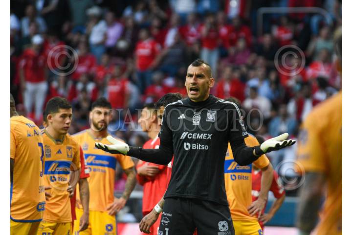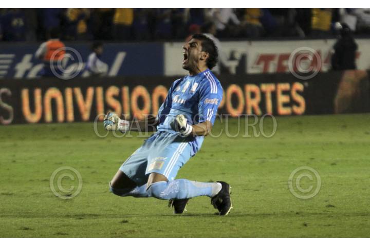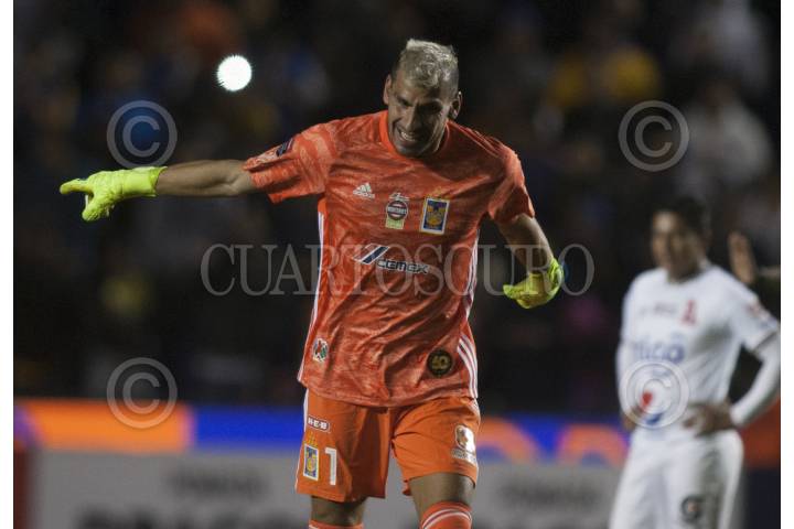 Nahuel Guzmán portero de los Tigres, quienes consiguieron su pase a semifinales, con un marcador global ante Diablos 5-4 en el estadio Nemesio Diez.