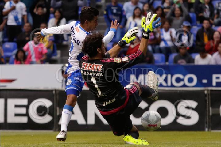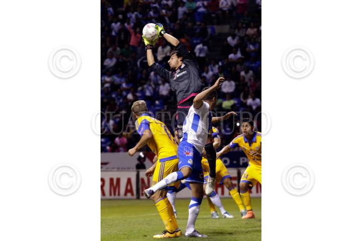 PUEBLA, PUEBLA, 20MARZO2016.- Los jugadores Eduardo Péres y Nahuel Guzmán, durante jugada del partido entre el Puebla de la Franja y los Tigres de la UANL empatado a cero goles, correspondiente a la jornada 11 del torneo de clausura 2016 de la Liga BBVA Bancomer MX, disputado en el estadio Cuauhtémoc. FOTO: HILDA RÍOS /CUARTOSCURO.COM