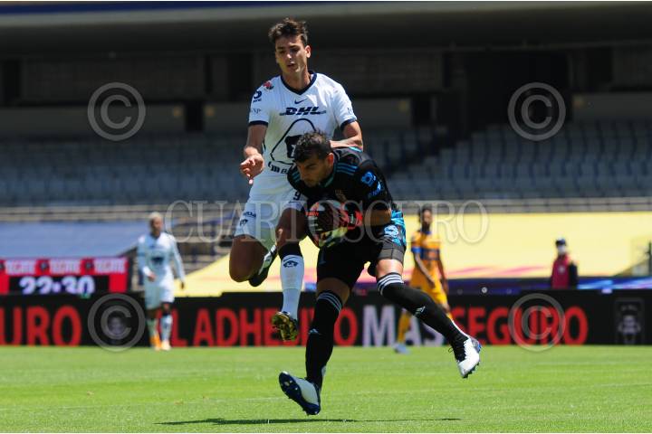Juan Ignacio Dinenno (Pumas) choca con el Nahuel Guzmán, portero de los Tigres de la UANL, durante el partido que termino a cero goles en el Estadio Olímpico Universitario.