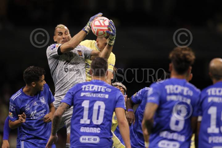 El portero Nahuel Guzmán de Tigres se queda con una pelota tras un tiro de esquina durante el partido de fútbol América vs Tigres correspondiente a la jornada 12 del Torneo Apertura 2022 de Liga BBVA MX, en el estadio Azteca.