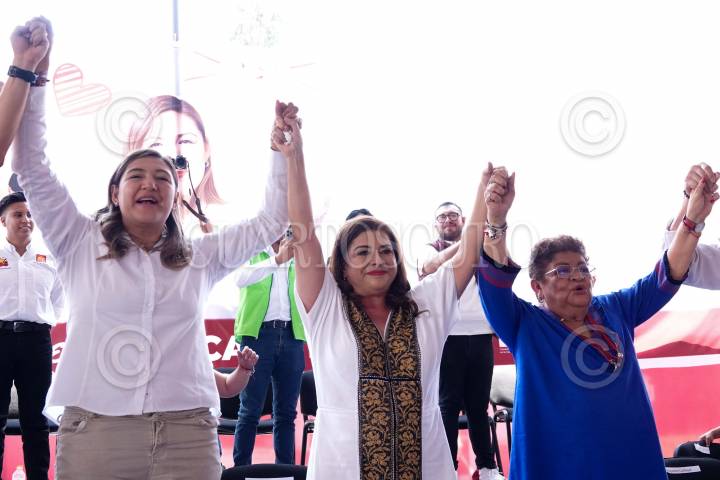 CIUDAD DE MÉXICO, 26MAYO2024.- Nancy Nuñez, candidata a la alcaldía de Azcapotzalco; Clara Brugada, candidata a la Jefatura de Gobierno, y Ernestina Godoy, candidata a senadora, durante el cierre de campaña en la explanada de esta demarcación. FOTO: GRACIELA LÓPEZ /CUARTOSCURO.COM
