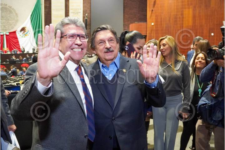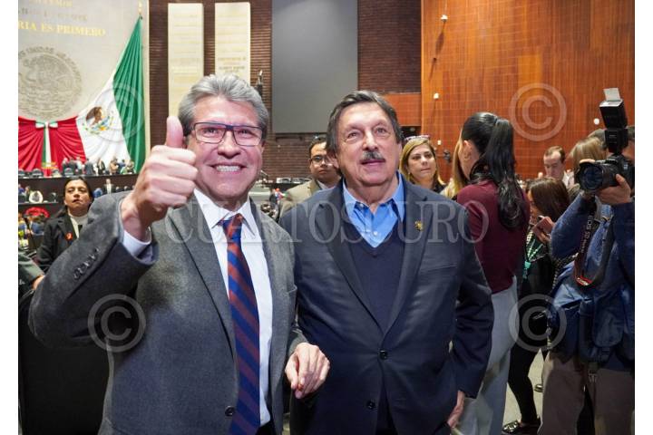 CHILPANCINGO, GUERRERO, 03DICIEMBRE2024.- Ricardo Monreal, coordinador de los Senadores de Morena, y Napoleón Gómez Urrutia, diputado de Morena y líder minero, durante la sesión en la Cámara de Diputados. FOTO: ELIZABETH RUIZ/CUARTOSCURO.COM
