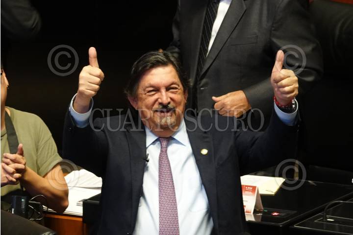 El senador Napoleón Gómez Urrutia la Sesión ordinaria en materia de proyecto de decreto por el que se reforman los artículos 76 y 78 de la ley Federal del trabajo, realizada en el Senado de la República