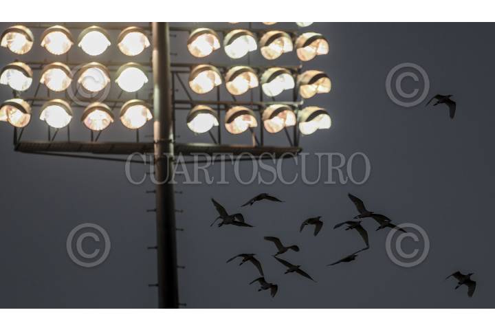 HERMOSILLO, SONORA, 15OCTUBRE2016.- Silueta de aves acuáticas pasan a un costado las lamparas que iluminan el estadio Sonora. Aspectos previos al partido de beisbol entre Naranjeros de Hermosillo vs Mayos de Navojoa. Temporada Potosinos de la Liga Mexicana del Pacifico 2016-2017. FOTO: LUIS GUTIÉRREZ / NORTE PHOTO/CUARTOSCURO.COM
