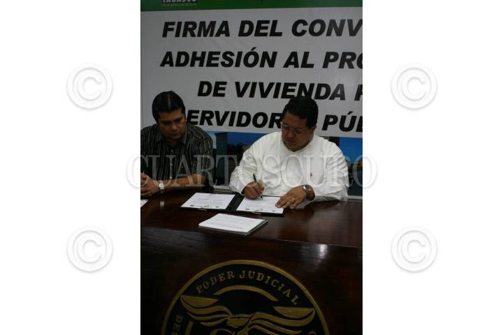 VILLAHERMOSA, TABASCO, 17NOVIEMBRE2005.- En el edificio del Tribunal Superior de Justicia se llevò a cabo la Firma del Convenio de Adhesiòn de Vivienda para Servidores Públicos, en la cual Manuel Andrade Díaz, gobernador del estado, firmó como testigo, constatado por el Presidente Magistrado Guillermo Narvaez Osorio. FOTO: Marco Polo Guzmàn/CUARTOSCURO.COM