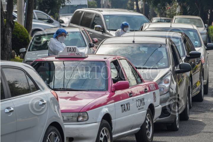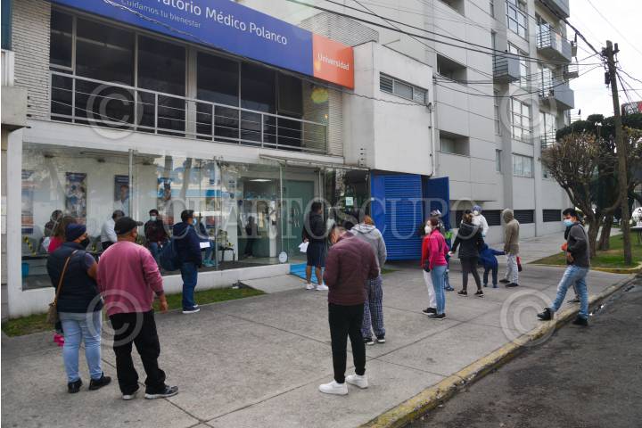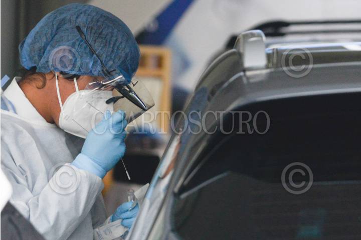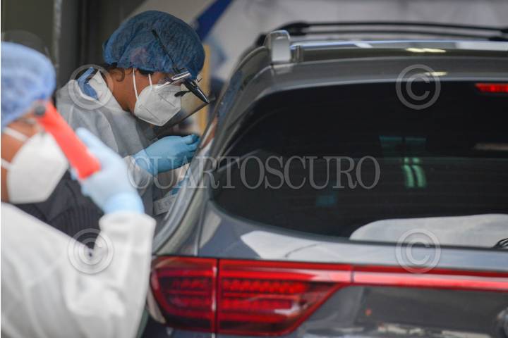 Personas acuden a realizarse la prueba de detección de covid-19 en un laboratorio privado ubicado en la Narvarte Oriente, con la posibilidad de poder hacérsela desde su automóvil al interior del estacionamiento del laboratorio.