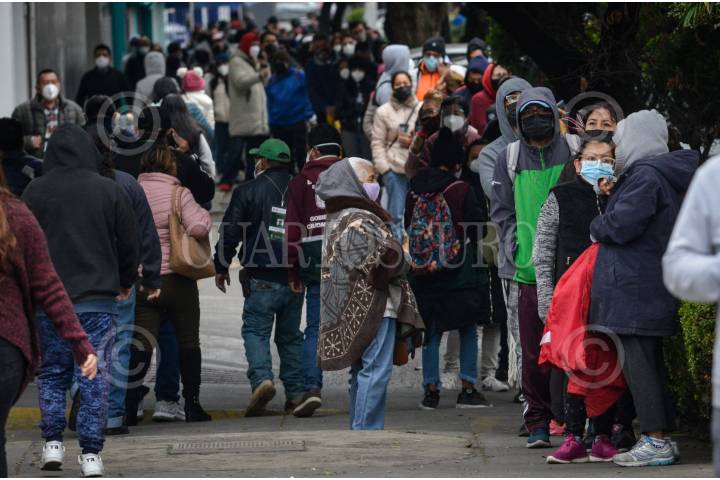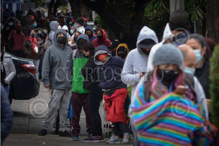 Personas esperan en largas filas para poder realizarse la prueba rápida de detección de Covid-19 en el "macro kiosko" reinstalado al exterior del metro Etiopía.