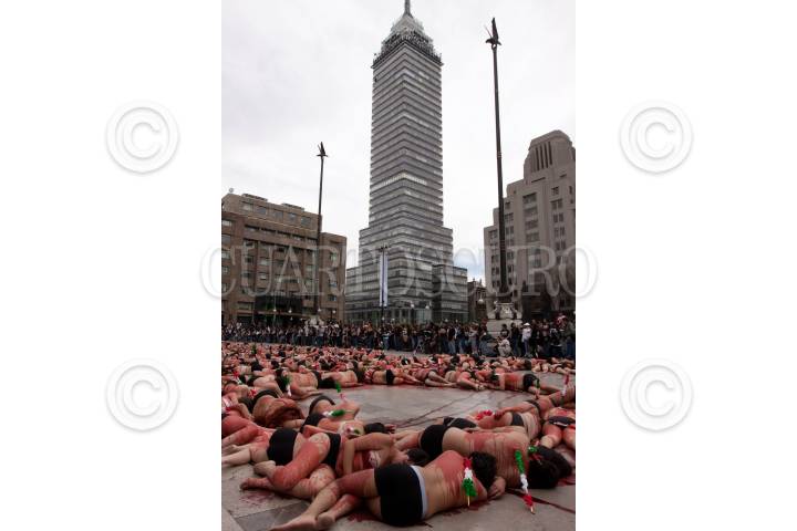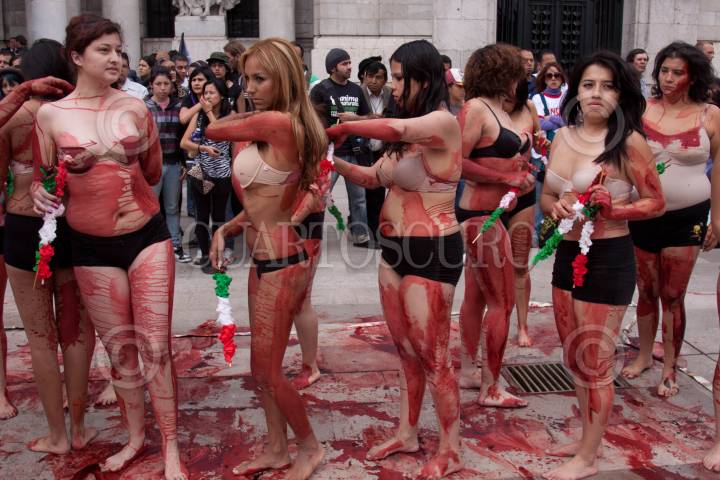 MÉXICO, D.F., 06FEBRERO2011.- Activistas de la organización ambientalista AnimaNaturalis se manifestaron semidesnudos y banderillados frente al Palacio de Bellas Artes formando la palabra BASTA para exigir al gobierno la abolición de la tauromaquia. FOTO: IVÁN STEPHENS/CUARTOSCURO.COM
