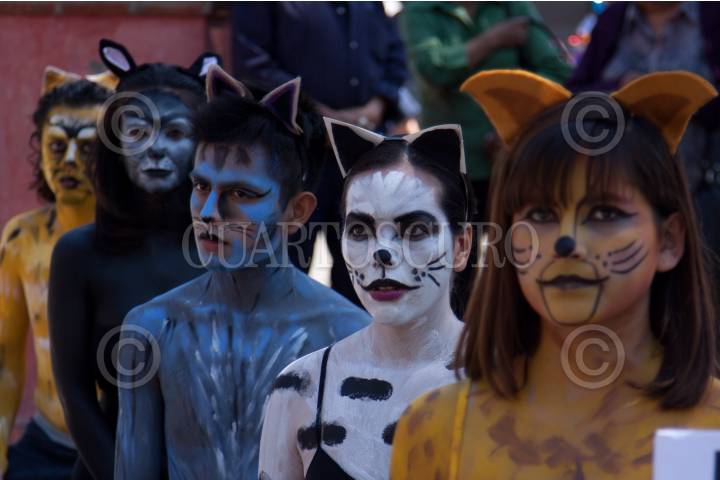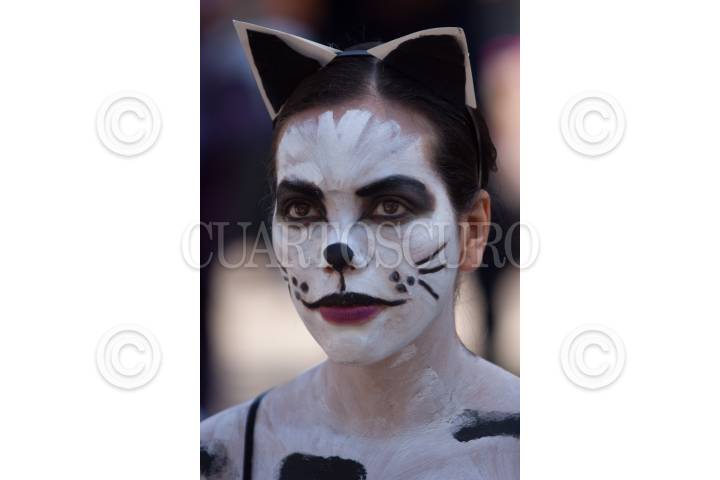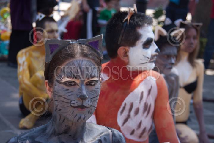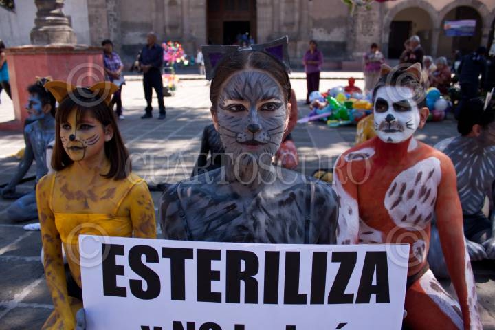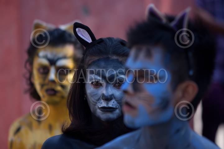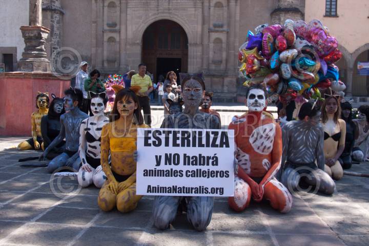 MÉXICO, D.F., 20FEBRERO2011.- Activistas de la organización ambientalista AnimaNaturalis, semidesnudos y caracterizados como gatos se manifestaron frente a la iglesia de San Juan Bautista en Coyoacán, para buscar crear conciencia sobre la importancia de la esterilización como medida para evitar la sobrepoblación callejera de gatos. FOTO: IVÁN STEPHENS/CUARTOSCURO.COM