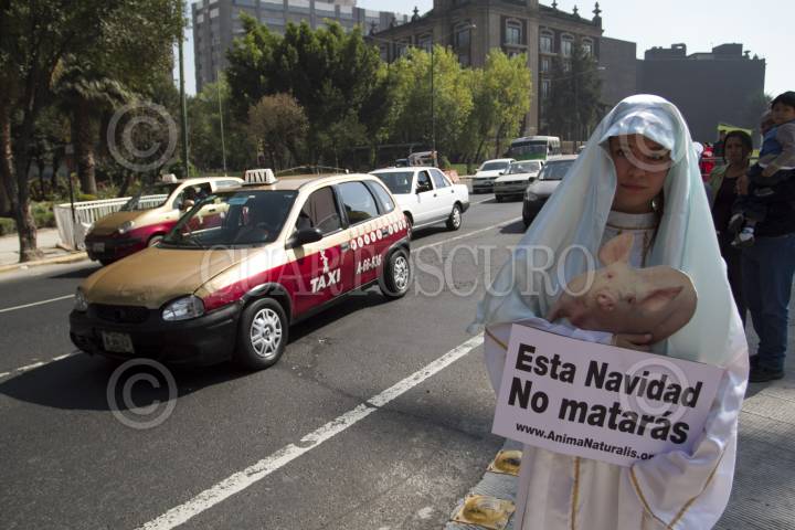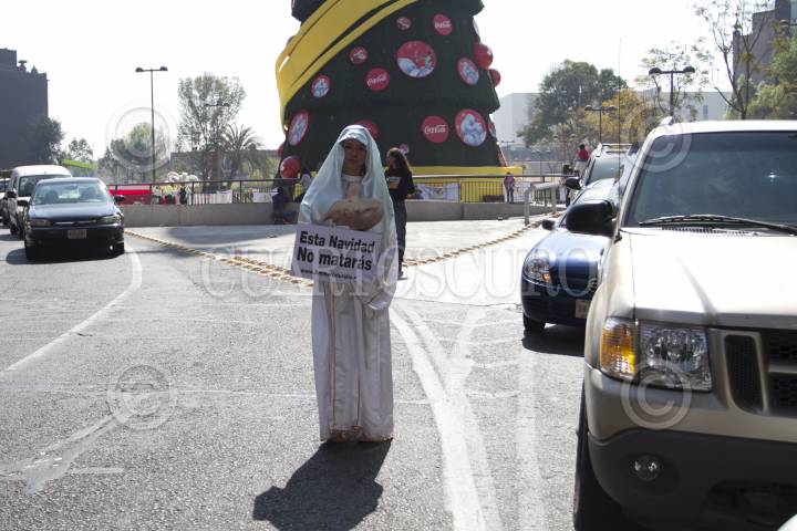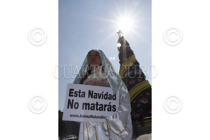 MÉXICO, D.F., 22DICIEMBRE2012.- Una activista de Animal Naturalis, caracterizada como ángel y sosteniendo un cartel con la leyenda "No matarás" busca concienciar a la sociedad sobre la circunstancia que viven los animales explotados para consumo humano. FOTO: GUILLERMO PEREA /CUARTOSCURO.COM