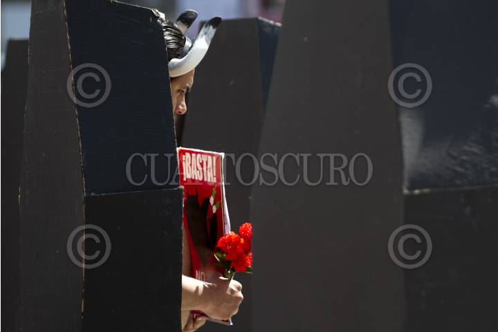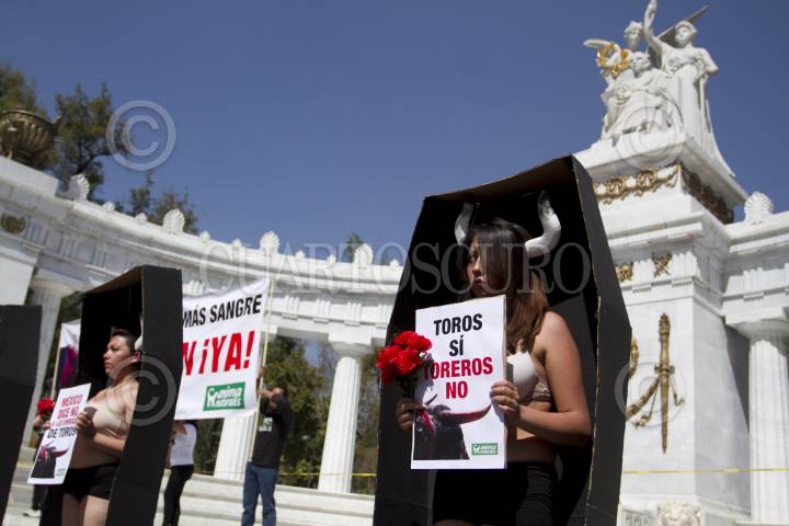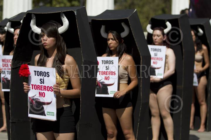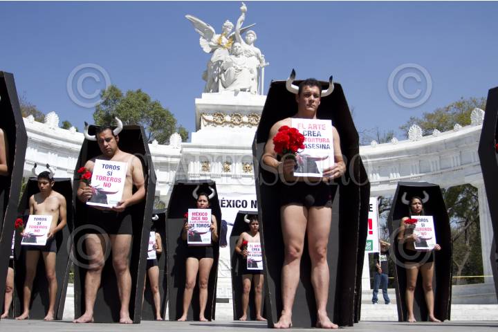MÉXICO, D.F., 02FEBRERO2014.- Integrantes de Animal Naturalis, protestaron semidesnudos y dentro de unos ataúdes de cartón, en contra de las corridas de toros en el Hemiciclo a Benito Juárez. FOTO: GUILLERMO PEREA /CUARTOSCURO.COM