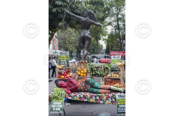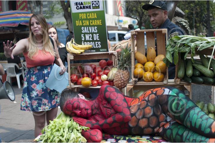 MÉXICO, D.F., 20MARZO2014.- Integrantes de la organización Anima Naturalis realizaron una protesta en la que invitaron a la población a no consumir productos de origen natural en el cruce de las calles Génova y Hamburgo de la Colonia Juárez FOTO: IVÁN STEPHENS /CUARTOECURO.COM