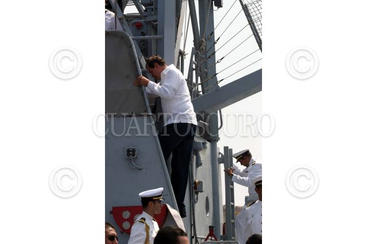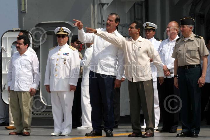 Boca del Río, Veracruz, 17FEBRERO2005.- Vicente Fox Quesada, presidente de la República y Fidel Herrera, gobernador de Veracruz, acudieron a la ceremonia de abanderamiento de las patrulla Oceanica conformada por las naves Patrulla Oceanica California y la Patrulla Misilera Huracan de las Fuerzas Armadas de México. FOTO: Moisés Pablo/CUARTOSCURO.COM