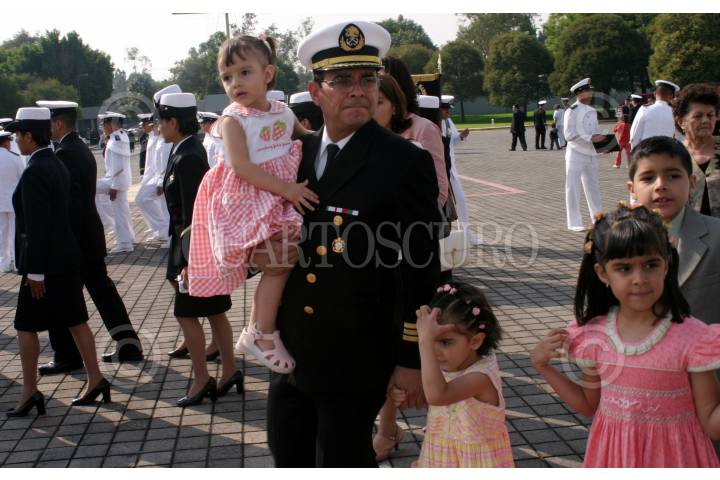 México, D.F., 16JULIO2004.- Un integrante de las fuerzas navales de México, es acompañado de sus hijas, al terminar la ceremonia de clausura y apertura de cursos de los planteles educativos navales. FOTO: Moisés Pablo/CUARTOSCURO.COM