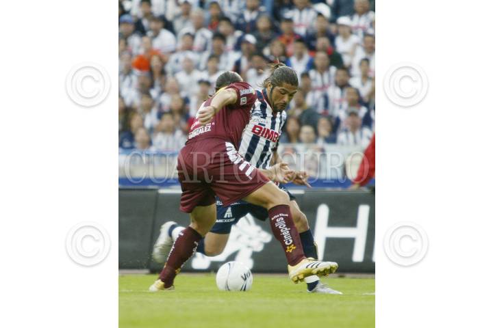 MONTERREY, NUEVO LEÓN 28ENERO2006.- Reynaldo Navia (Monterrey) evade la marca de Humberto González (Morelia) en el partido de la jornada 2 del torneo de clausura 2006 en el que Monterrey venció a monarcas Morelia 1-0 con gol del colombiano Hugo Rodallega. FOTO: Roberto Martínez/CUARTOSCURO.COM