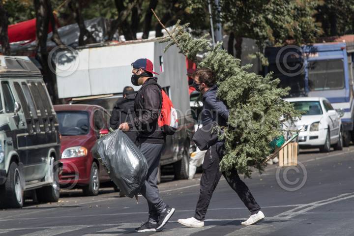 Un par de hombres llevan su árbol de navidad para ser reciclado en el centro instalado en el Parque de los Venados.
