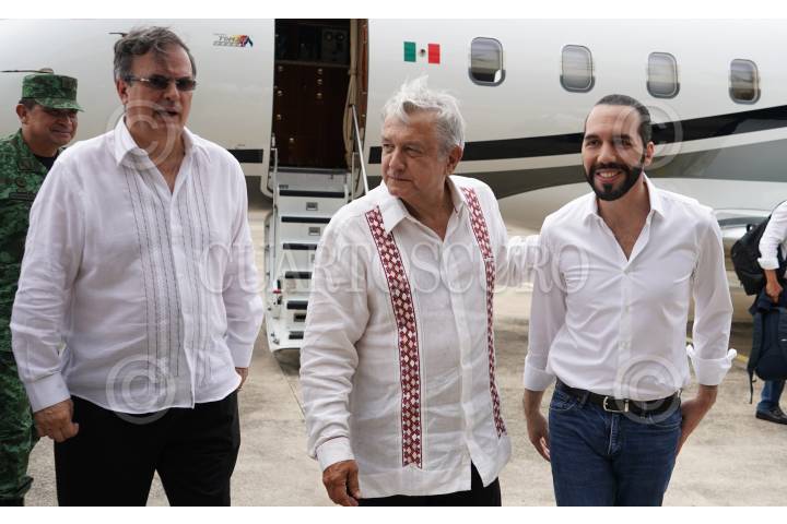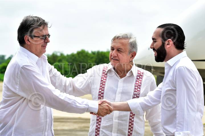 TAPACHULA, ESTADO DE MÉXICO, 20JUNIO2019.- Andrés Manuel López Obrador, Presidente de México recibió a Nayib Bukele, mandatario de El Salvador, en el aeropuerto de la base militar de Tapachula. Los acompaño el secretario de Relaciones Exteriores, Marcelo Ebrard Casaubón. FOTO: PRESIDENCIA /CUARTOSCURO.COM