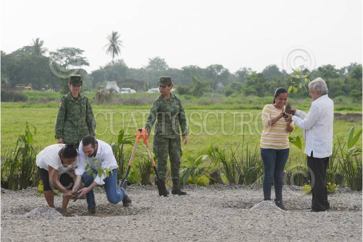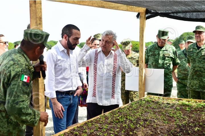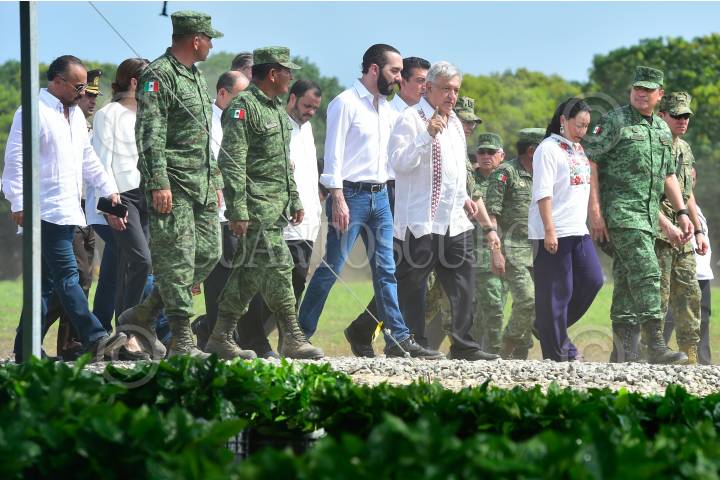 TAPACHULA, CHIAPAS, 20JUNIO2019.- Andrés Manuel López Obrador, Presidente de México, Nayib Bukele, mandatario de El Salvador asistieron a la presentación del programa ¨Sembrando Vida¨, Plan de Desarrollo para Migración. El Jefe del Ejecutivo Federal estuvo acompañado de Óscar Gurría, presidente municipal de Tapachula; el General Luis Crescencio Sandoval, secretario de la Defensa Nacional; Pablo Salvador Anliker Infante, ministro de Agricultura y Ganadería de El Salvador; Rutilio Escandón, gobernador de Chiapas; Alexandra Hill, ministra de Relaciones Exteriores de El Salvador, Marcelo Ebrard, secretario de Relaciones Exteriores; María Luisa Albores, secretaria de Bienestar; el Almirante José Rafael Ojeda, secretario de Marina; Ernesto Castro, secretario particular del presidente de El Salvador y Carolina Encinas, jefa de gabinete de El Salvador. FOTO: PRESIDENCIA /CUARTOSCURO.COM