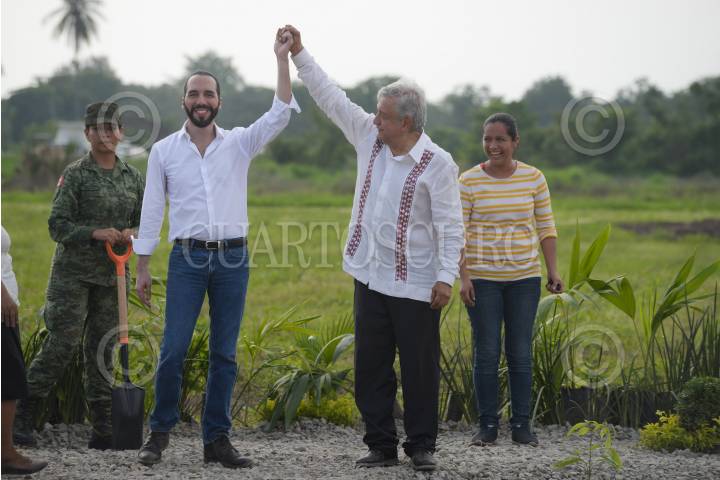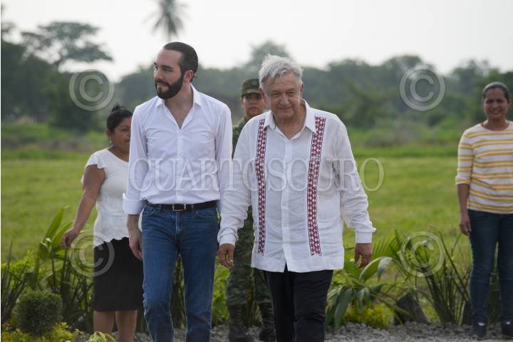 TAPACHULA, CHIAPAS, 20JUNIO2019.- Andrés Manuel López Obrador, Presidente de México, y Nayib Bukele, presidente de El Salvador, presentaron el Plan de Desarrollo para Centroamérica, ambos mandatarios trataron los remas de migración y política social, para detener el flujo de personas que abandonan el país para ir a Estados Unidos. El Jefe del Ejecutivo azteca anunció que se invertirán 30 millones de dólares para arrancar con el plan, recursos que se utilizarán para el programa "Sembrando Vida" en El Salvador. FOTO: ISABEL MATEOS /CUARTOSCURO.COM