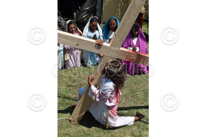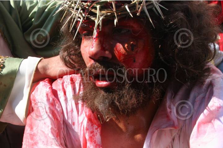MÉXICO, D.F., 10ABRIL2009.- Jesús de Nazareth interpretado por el joven Diego Zirahuen Villagrán durante la primera caída en la tradicional representación del viacrucis de La Pasión en Iztapalapa. FOTO: RODOLFO ANGULO/CUARTOSCURO.COM