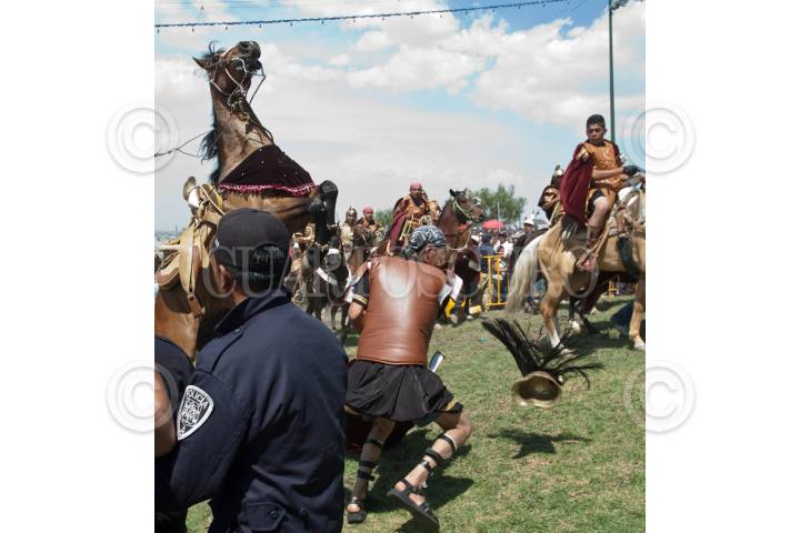 MÉXICO, D.F., 10ABRIL2009.- Un Romano perdio el control de un caballo en el cerro de la Estrella tras llegar en la tradicional representación del viacrucis de La Pasión en Iztapalapa. FOTO: RODOLFO ANGULO/CUARTOSCURO.COM