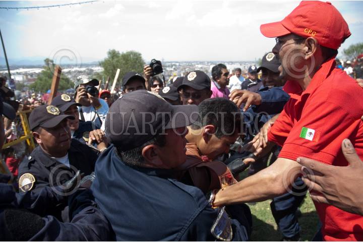 MÉXICO, D.F., 10ABRIL2009.- Policias golpean a una persona caracterizada de Romano tras perder el control de un caballo en el cerro de la Estrella después de llegar en la tradicional representación del viacrucis de La Pasión en Iztapalapa. FOTO: RODOLFO ANGULO/CUARTOSCURO.COM