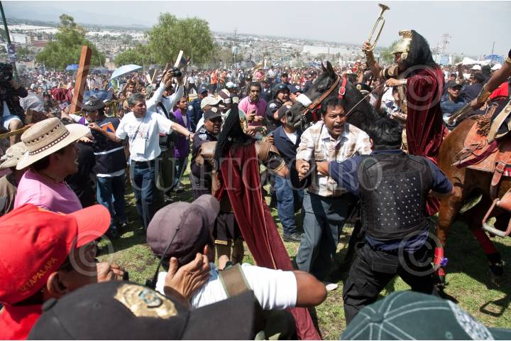 MÉXICO, D.F., 10ABRIL2009.- Policías y personas caracterizadas de Romanos pelean después de que un Romano perdio el control de un caballo en el cerro de la Estrella después de llegar en la tradicional representación del viacrucis de La Pasión en Iztapalapa. FOTO: RODOLFO ANGULO/CUARTOSCURO.COM