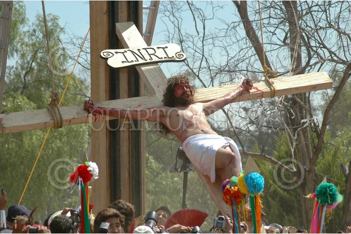 MÉXICO, D.F., 10ABRIL2009.- Jesús de Nazareth, interpretado por Diego Zirahuen Villagrán, es crucificado al termino de la tradicional representación del viacrucis de La Pasión en Iztapalapa. FOTO: RICARDO CASTELAN/CUARTOSCURO.COM