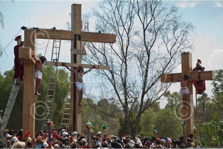 MÉXICO, D.F., 10ABRIL2009.- Jesús de Nazareth interpretado por el joven Diego Zirahuen Villagrán es crucificado al lado de dos ladrones al termino de la tradicional representación del viacrucis de La Pasión en Iztapalapa. FOTO: RODOLFO ANGULO/CUARTOSCURO.COM