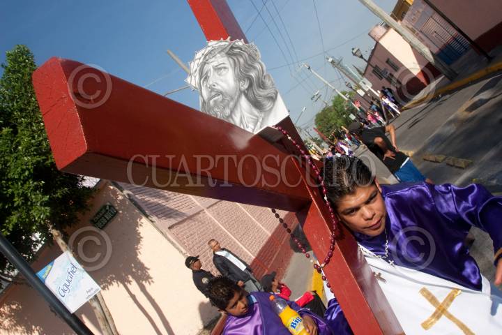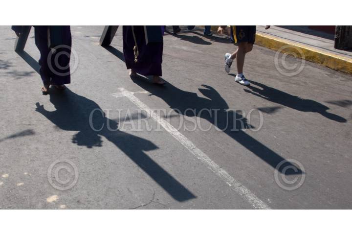 MÉXICO, D.F., 10ABRIL2009.- Nazarenos cargan sus cruces y coronas de espinas durante la procesión previa al Viacrucis en la tradicional representación de La Pasión que se celebra en Iztapalapa. FOTO: RICARDO CASTELAN/CUARTOSCURO.COM