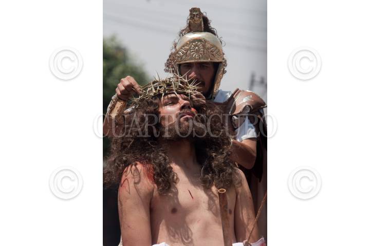 MÉXICO, D.F., 10ABRIL2009.- Jesús de Nazareth interpretado por el joven Diego Zirahuen Villagrán durante la escena bíblica donde le colocan una corona de espinas esto durante la representación anual de la pasión de cristo en Iztapalapa. FOTO: RICARDO CASTELAN/CUARTOSCURO.COM
