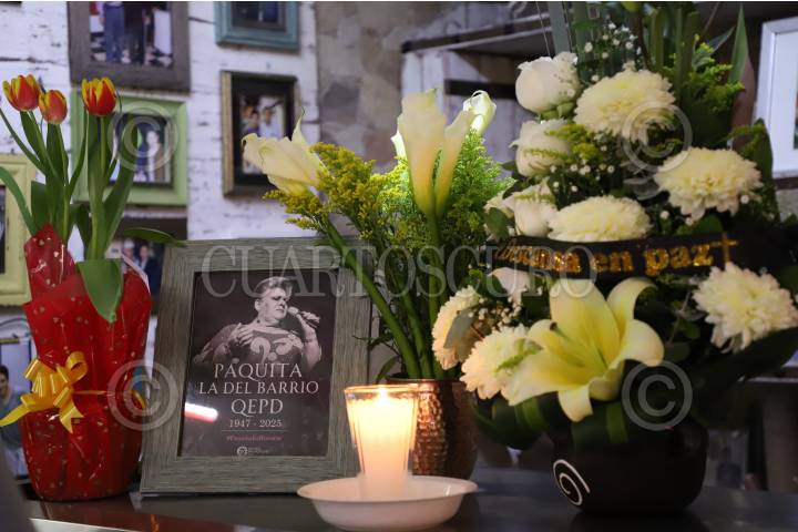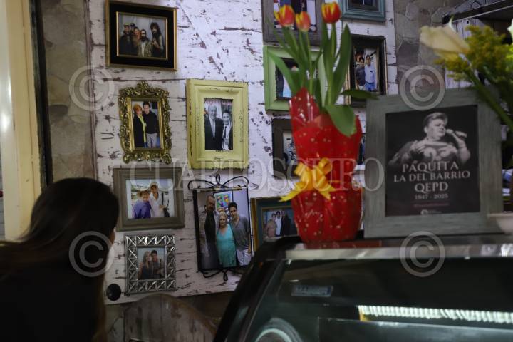 CIUDAD DE MÉXICO, 17FEBRERO2025.- La cantante mexicana, Paquita la del Barrio, falleció este lunes en su natal Veracruz a la edad de 77 años. En el negocio que le pertenece a su manager, Francisco Torres, colocaron una fotografía de ella acompañada de flores. FOTO: DANIEL AUGUSTO/ CUARTOSCURO.COM
