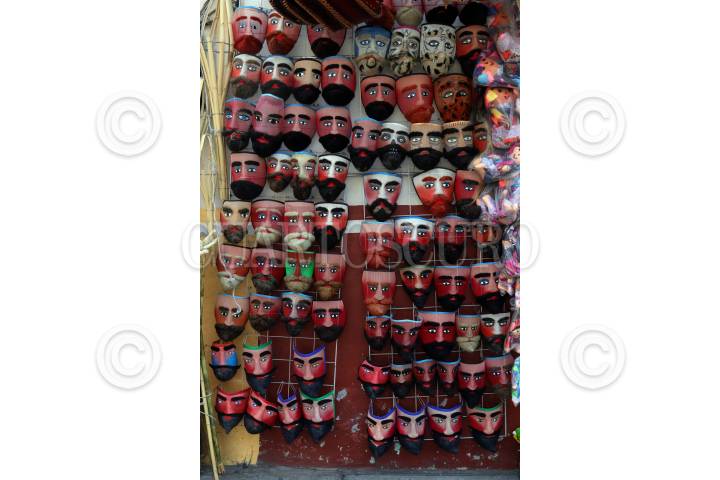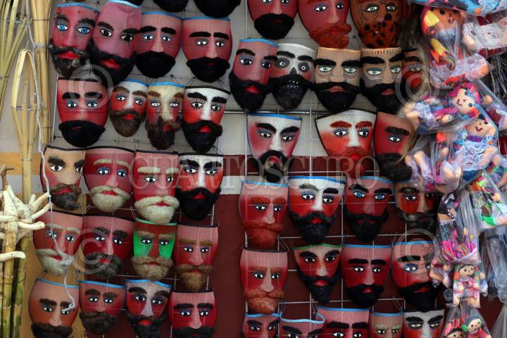 Mascaras de chinelos a la venta en un negocio en el pueblo de Tepoztlán.