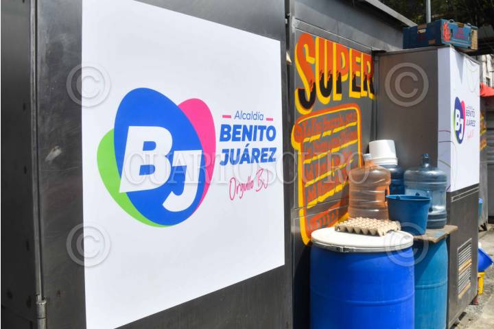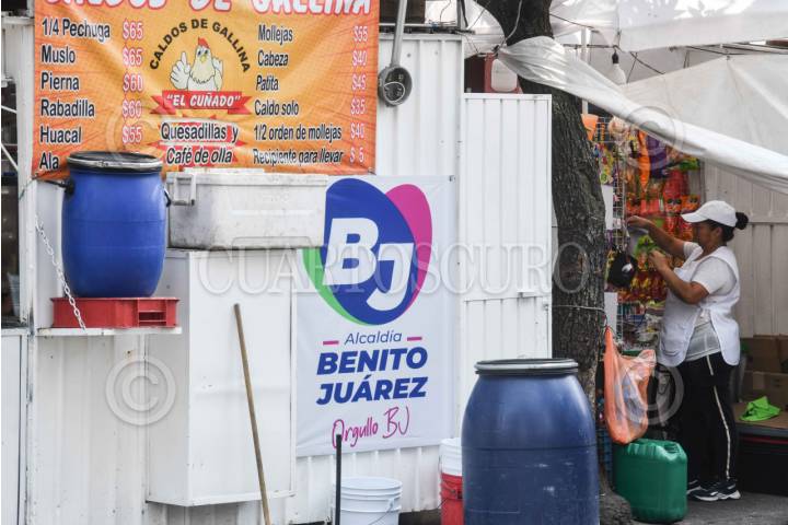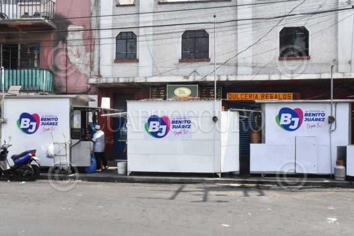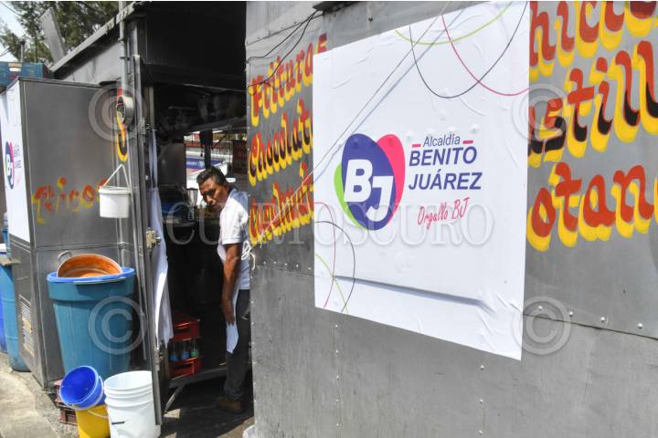 CIUDAD DE MÉXICO, 25ABRIL2025.- Logos de la alcaldía Benito Juárez comenzaron a ser colocados en diversos puestos comerciantes (con rótulos) que se encuentran en las inmediaciones de la avenida Tlalpan. Las autoridades de dicha alcaldía han negado que se trate de alguna imposición. FOTO: MARIO JASSO/CUARTOSCURO.COM
