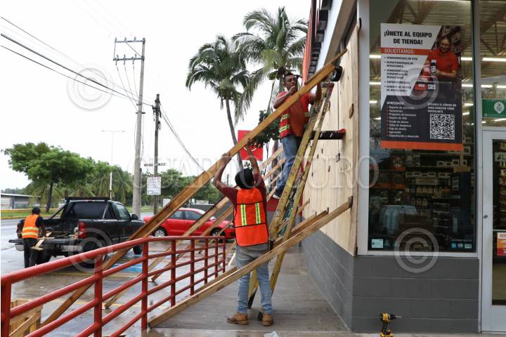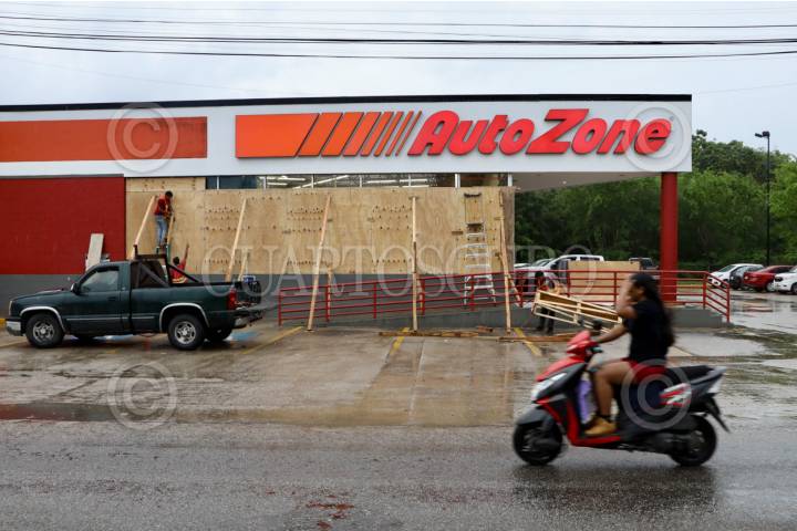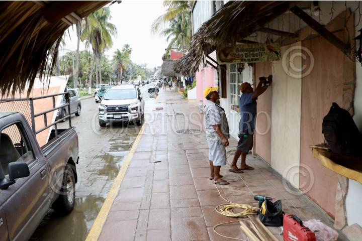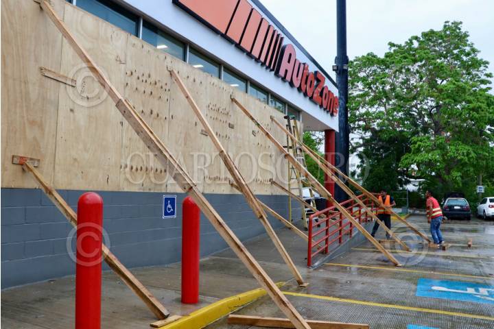 SAN PEDRO MIXTEPEC, OAXACA, 18JUNIO2025.- Algunos negocios en Puerto Escondido, incluyendo establecimientos de autopartes, han sido tapiados ante la llegada del huracán Erick, que avanza como categoría 2 hacia las costas de Oaxaca y Guerrero. Se espera que el fenómeno toque tierra la madrugada del jueves 19 de junio como categoría 3 en la zona limítrofe entre ambos estados. FOTO: CAROLINA JIMÉNEZ MARISCAL / CUARTOSCURO.COM