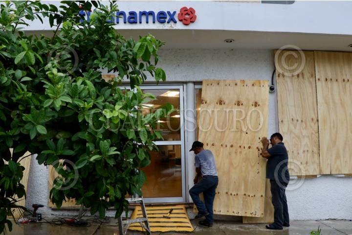 SAN PEDRO MIXTEPEC, OAXACA, 18JUNIO2025.- Sucursales bancarias y otros negocios en Puerto Escondido han tomado precauciones, como tapiar sus instalaciones, ante la llegada del huracán Erick, que avanza como categoría 2 hacia las costas de Oaxaca y Guerrero. El pronóstico indica que podría tocar tierra la madrugada del jueves 19 de junio como categoría 3 en la zona limítrofe entre ambos estados. FOTO: CAROLINA JIMÉNEZ MARISCAL / CUARTOSCURO.COM