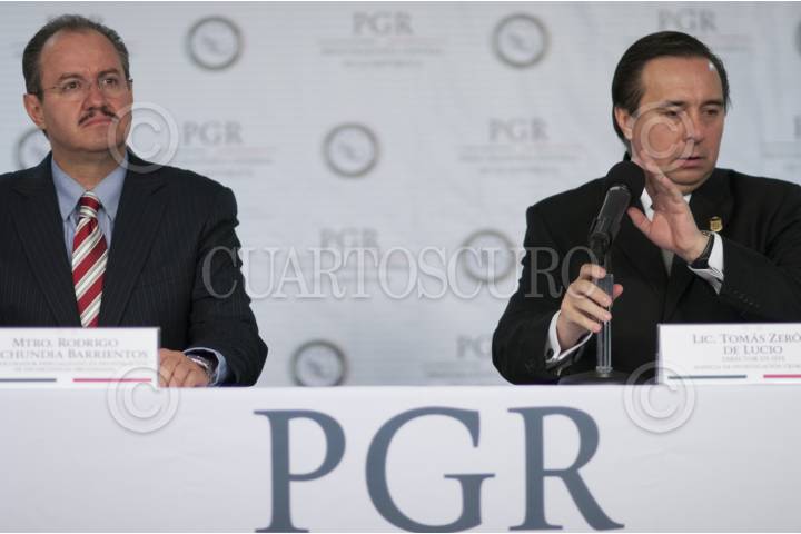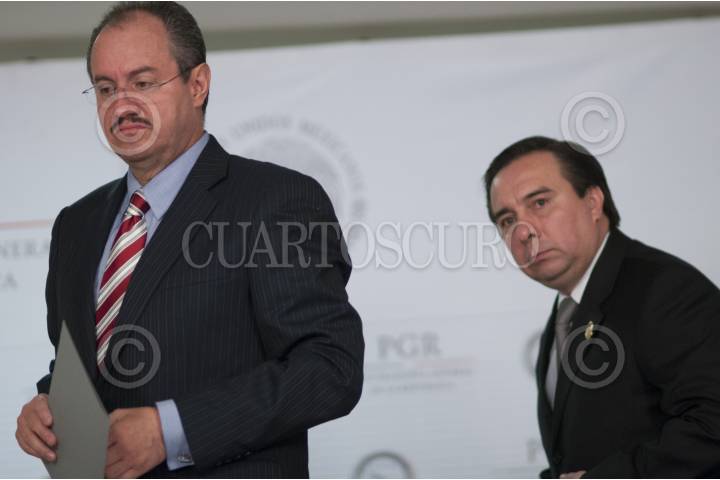 MÉXICO, D.F., 01SEPTIEMBRE2014.- Rodrigo Archundia Barrientos, subprocurador especializado en Delincuencia Organizada; y Tomás Zerón de Lucio, director en jefe de la Agencia de Investigación Criminal, ratificaron que la explosión en las oficinas del SAT en Piedras Negras, Coahuila, fue por una fuga de gas en una línea subterránea. Advirtieron que en el lugar del percance en que murió una mujer, no se encontraron indicios de ningún explosivo. FOTO: IVÁN STEPHENS /CUARTOSCURO.COM