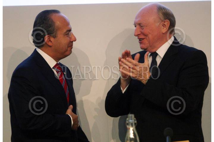 LONDRES, INGLATERRA, 01ABRIL2009.- Felipe Calderón, Presidente de México acompañado por el Lord Neil Kinnok, Presidente del Consejo Británico durante su participación en el 75 aniversario del Consejo Británico que tuvo lugar en el Trust Lecture Theater de la Royal Society. FOTO: ARIEL GUTIERREZ/CUARTOSCURO.COM