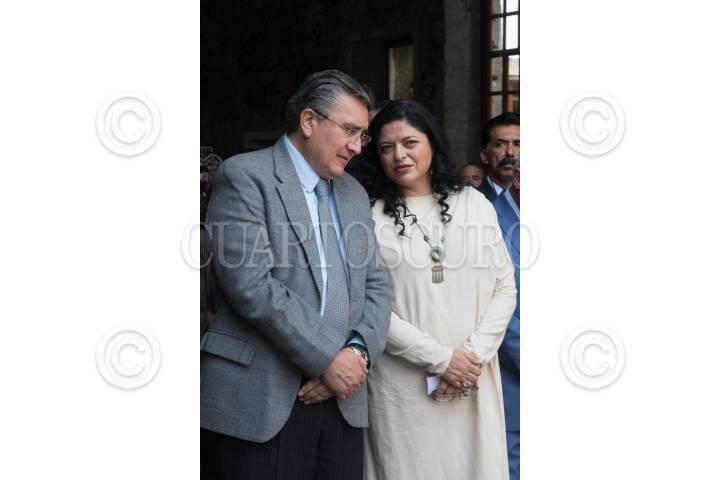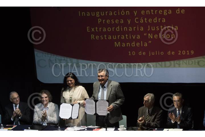 CIUDAD DE MÉXICO, 10JULIO2019.- Luis Raúl González Pérez, presidente de la CNDH, y Alejandra Frausto, secretaria de Cultura, durante la inauguración y entrega de Presea y Cátedra Extraordinaria Justicia Restaurativa "Nelson Mandela", en la Biblioteca de México. FOTO: MOISÉS PABLO /CUARTOSCURO.COM