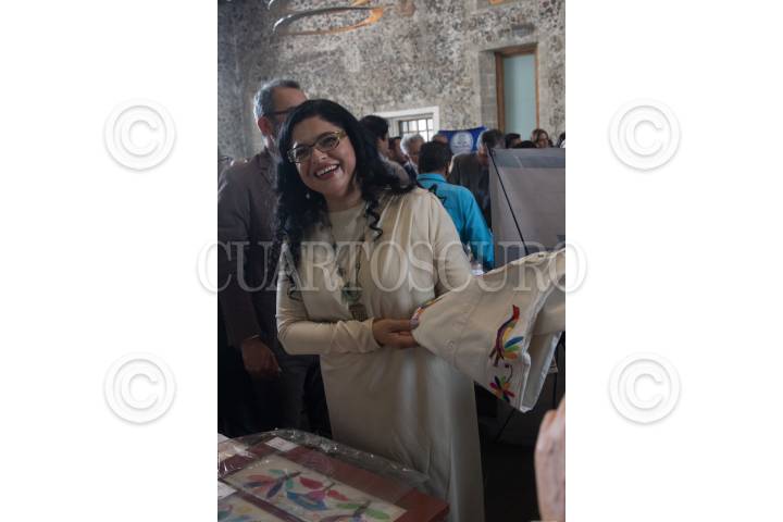 CIUDAD DE MÉXICO, 10JULIO2019.- La secretaria de Cultura, Alejandra Frausto, recorrió la exposición que fue inaugurada tras terminar el protocolo "Día Internacional de Nelson Mandela", en la Biblioteca de México. En la imagen compro una camisola hecha por artesanos se encuentran recluidos, informó que no quería llegar con las manos vacías a su reunión con el nuevo Secretario de Hacienda. FOTO: MOISÉS PABLO /CUARTOSCURO.COM