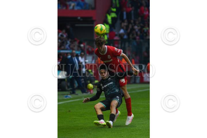 TOLUCA, ESTADO DE MÉXICO, 06ABRIL2025.- Marcel Ruiz medio de los Diablos de Toluca y Jordan Carrillo medio de Santos, en el partido correspondiente a la jornada 14 del Torneo Clausura de la Liga MX, el encuentro culminó con un marcador 2-1. FOTO: CRISANTA ESPINOSA AGUILAR /CUARTOSCURO.COM