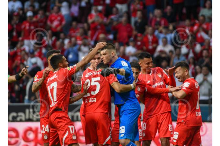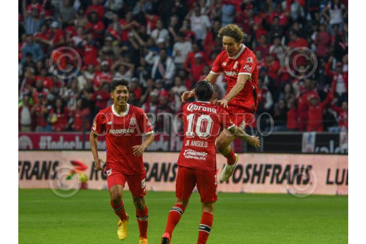 TOLUCA, ESTADO DE MÉXICO, 02MARZO2024.- Jugadores de los Diablos de Toluca festejan su anotación ante la escuadra de Tigres en el partido correspondiente a la jornada 10 del Torneo Clausura 2024, en el estadio Nemesio Diez, con un marcador final 2-1. FOTO: CRISANTA ESPINOSA AGUILAR /CUARTOSCURO.COM
